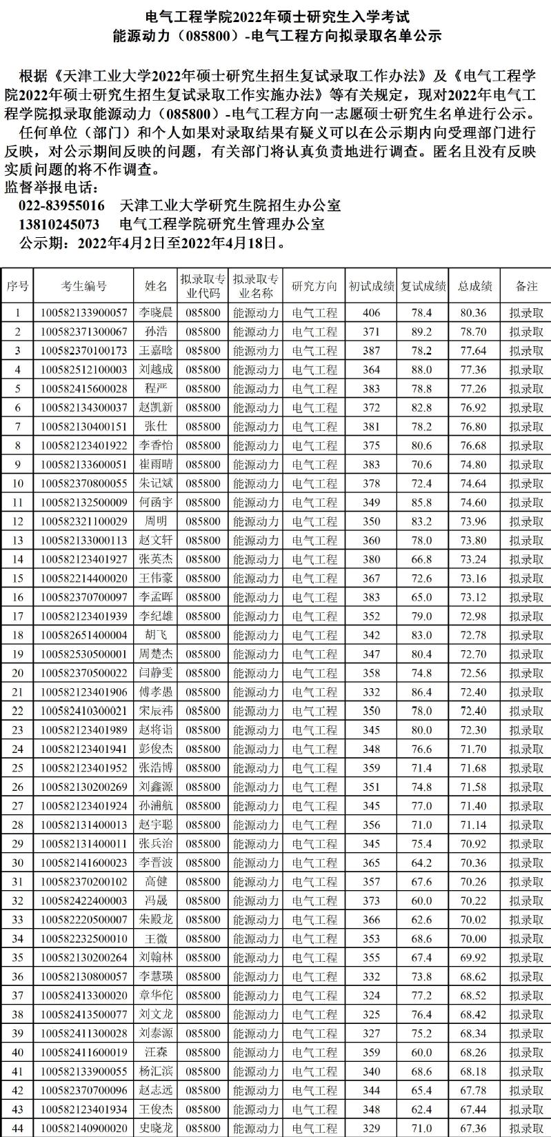 研招通知8:2022年硕士研究生入学考试能源动力(085800)-电气工程方向拟录取名单公示