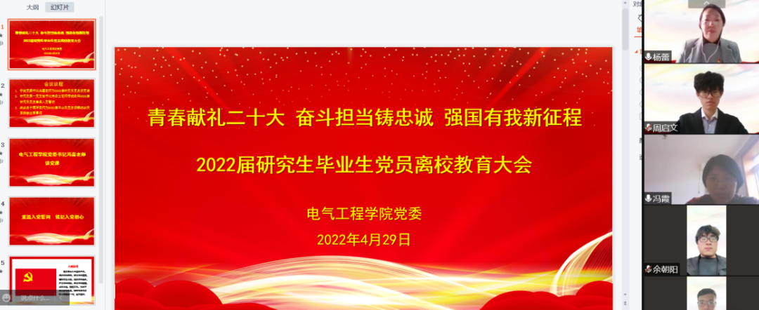 为进一步加强毕业生党员离校教育,提高毕业生党员党性修养,激励毕业生党员坚定信念、担当作为,在新的岗位上继续发挥先锋模范作用,电气工程学院党委于2022年4月29日下午举行2022届研究生毕业生党员教育大会,会议以视频形式召开。学院党委书记冯霞、组织员、研究生第一党支部书记以及全体研究生毕业生党员参加了会议,会议由党委副书记杨蕾主持。