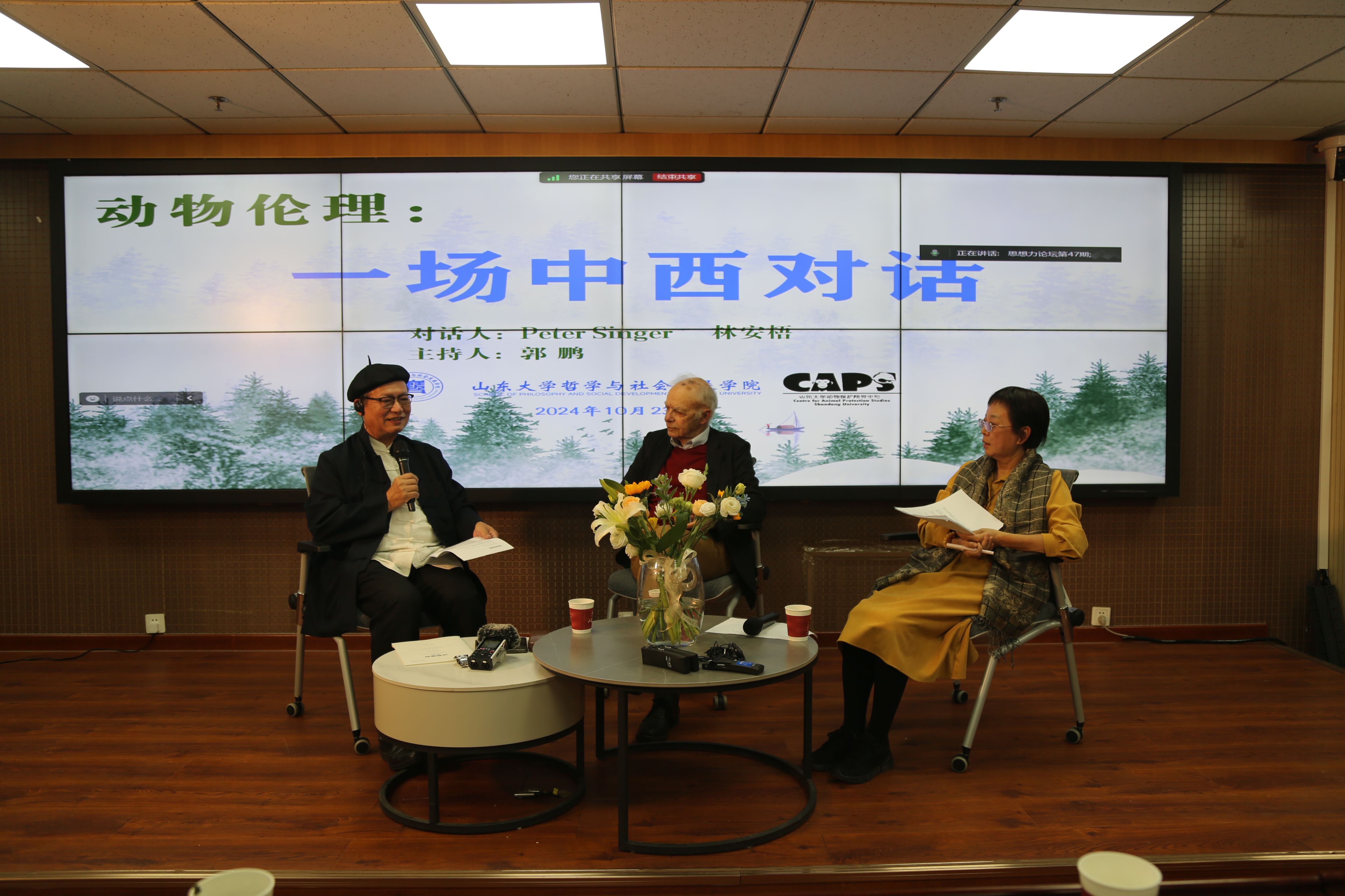 2024年10月23日,世界著名哲学家彼得·辛格教授到访william威廉中文,作为 “思想力论坛”第47期特邀嘉宾,与当代新儒家重要代表林安梧教授作了主题为“动物伦理:一场中西对话”的报告,由william威廉中文郭鹏副教授主持。报告在知新楼A1521学源报告厅举办,现场座无虚席,气氛热烈。