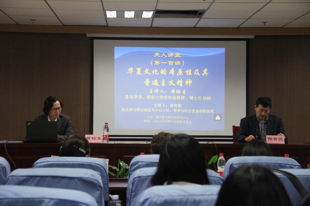 4月26日晚,“天人讲堂”第100讲顺利举办。著名学者、清华大学哲学系教授黄裕生应邀带来一场题为“华夏文化的本原性及其普遍主义精神”的报告。