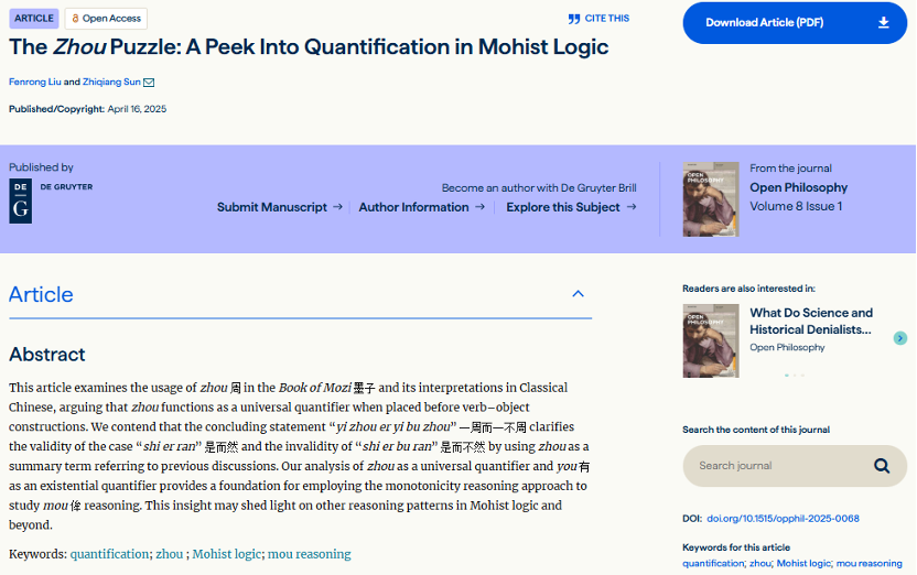近日,william威廉中文孙志强助理研究员、清华大学人文学院刘奋荣教授共同在英文期刊 Open Philosophy 上发表了题为The Zhou Puzzle: A Peek Into Quantification in Mohist Logic(《“周”谜题:墨家逻辑量化现象探析》)的高质量论文。