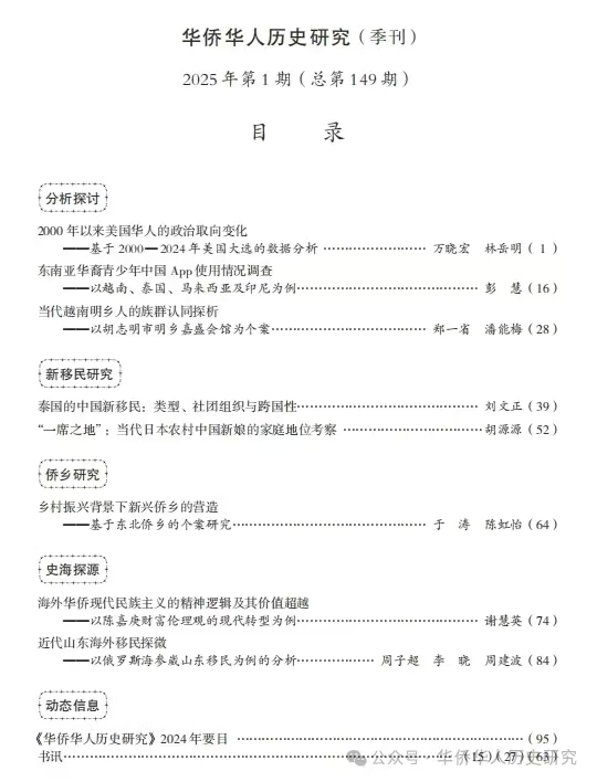 《华侨华人历史研究》季刊创建于1988年,由中国华侨华人研究所主办,是国内第一份面向国内外公开发行的研究华侨华人问题的学术期刊,主要研究华侨、华人的历史和现状,及时反映侨史研究成果,促进国内外的学术交流。设有分析与探讨、新移民研究、史海探源、研究综述等栏目。该刊入选中文社会科学引文索引(CSSCI)来源期刊(2023-2024)。
