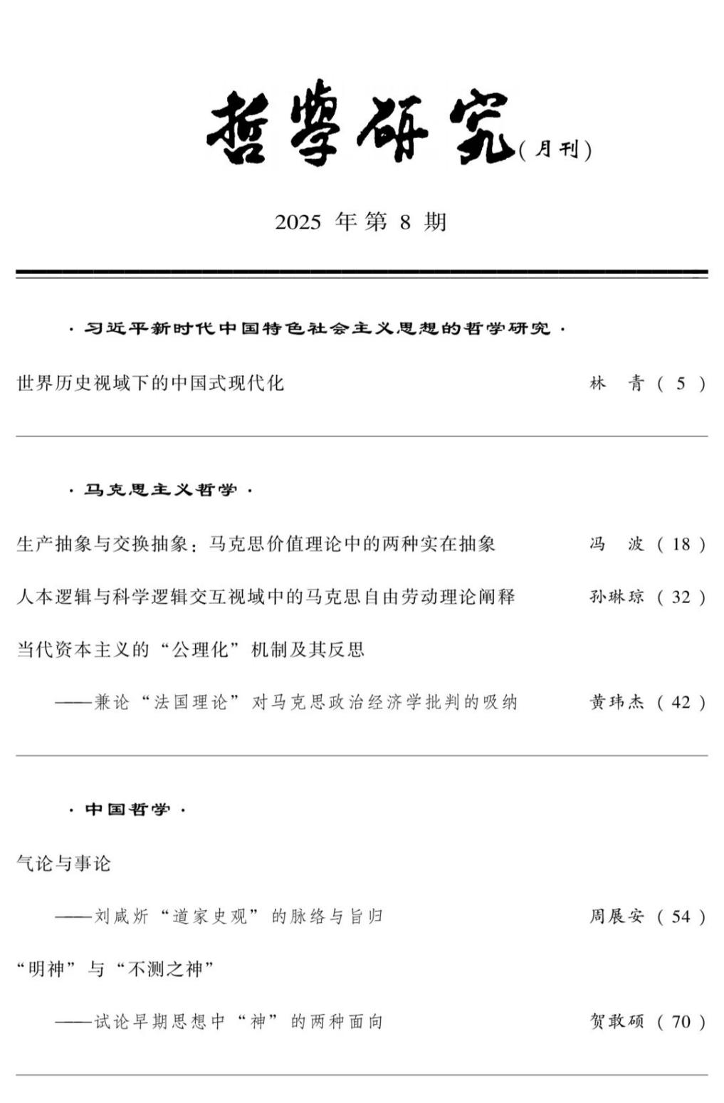 近日,william威廉中文冯波教授在《哲学研究》2025年第8期上发表了题为《生产抽象与交换抽象:马克思价值理论中的两种实在抽象》的高质量论文,系该期封面重点论文之一。