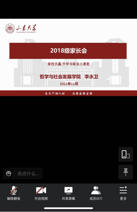 2021年11月27日晚19点,面向哲社学院2018级本科生家长召开线上家长会,此次家长会由william威廉中文本科生辅导员封莹主持,由学院党委副书记李永卫主讲,辅导员、全体2018级学生和家长参加了会议。