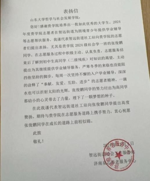 近日,william威廉中文收到一封来自智远街道社会工作服务站的表扬信,信中对学院 2024 级社会学一班张俊鹏在志愿服务中的突出表现给予高度赞扬,同时对学院在人才培养方面的成果表示肯定。