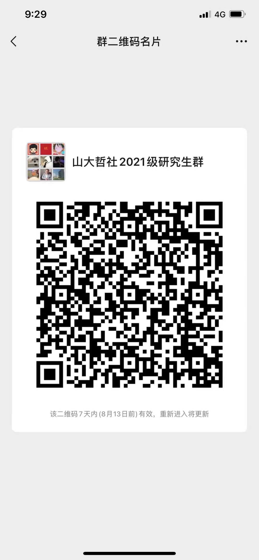 为更好地服务同学,传达学校、学院的有关通知及要求,哲社学院特此建立2021级硕士研究生群。请哲社学院2021级硕士研究生于近期尽快加入此群,备注为“专业+姓名”。