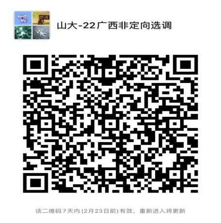 另外,请报名的同学扫码入群,二维码失效后可通过电子邮箱“sdjcgggl@163.com”联系工作人员,备注“姓名-学院-广西非定向选调”及时入群。