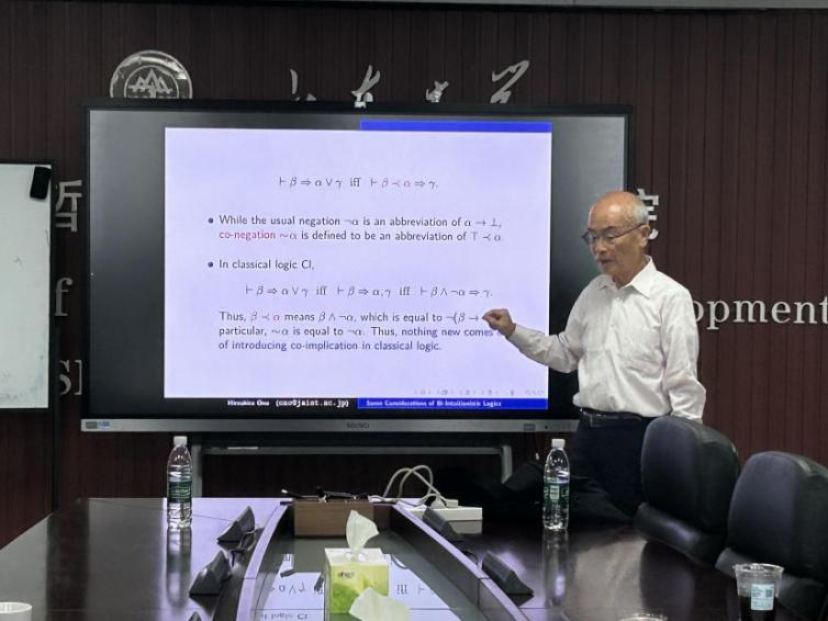 2025 年 9 月 22 日,“望岳——海外名师论坛”第14期在知新楼 A1618 举行。此次论坛邀请到日本北陆先端科学技术大学院大学小野宽晰教授做题为 “Some considerations of bi-intuitionistic logics” 的学术报告,报告由哲社学院梁飞老师主持。讲座前,梁飞老师先简要介绍了小野(Ono)教授的工作 —— 尤其是在“子结构逻辑”上成果的重要意义,且小野教授是少数在学术界获得广泛国际认可的亚洲逻辑学家,随后对小野教授到来表示欢迎。