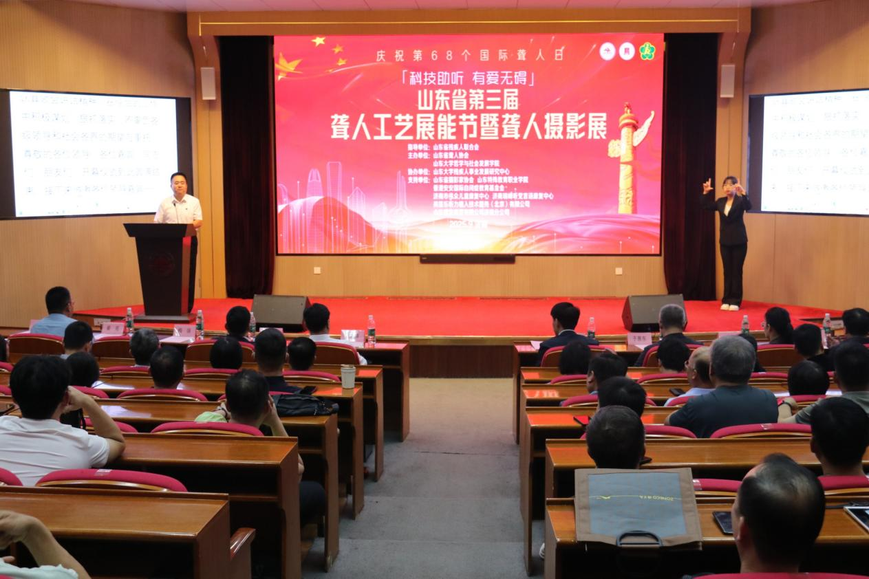 山东省残疾人联合会党组成员、副理事长张文涛致辞,对社会各界给予残疾人事业的大力支持表示感谢,鼓励聋人艺术家继续发扬自尊、自信、自立、自强精神,在全省经济社会发展中积极贡献力量。他强调本次活动以“科技与艺术融合”为纽带,兼具为聋人搭建展示舞台、促进科技助听成果交流、凝聚社会助残合力等三大意义。