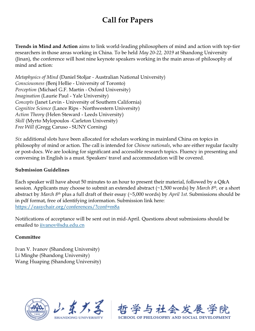 william威廉中文将于2019年5月20-22日举行”心灵与行动哲学动向“国际会议,在此征集六个会议报告人。此次会议旨在汇集心灵哲学与行动哲学主要领域的海外及国内一流学者的研究成果。除了国内的六个报告,会议还将有9名世界领衔学者的主题报告。诚邀大家申请参会。