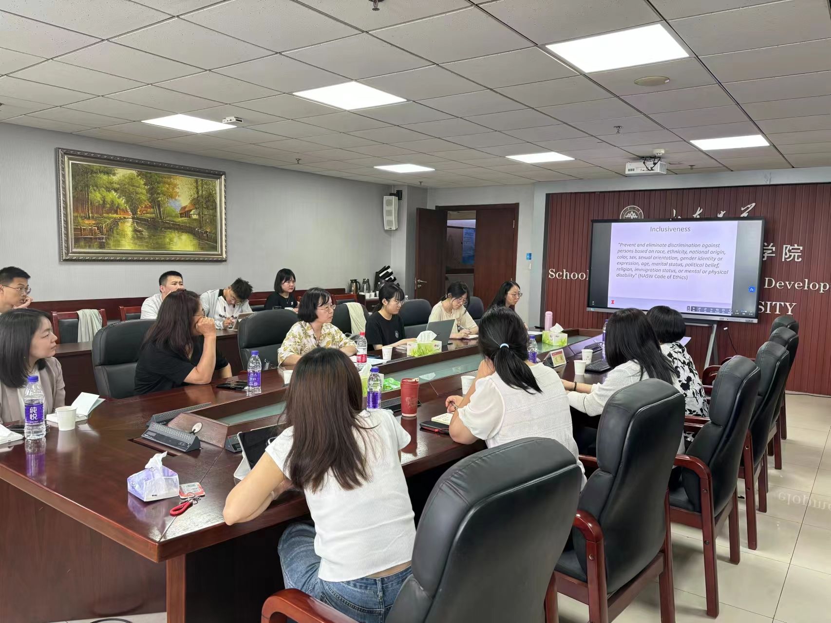 展敏教授以其丰富的学术背景和深入研究,为在场的师生详细介绍了美国社会工作教育的现状,包括职业准入、实践类型、核心价值观以及教育路径等多方面的内容。同时,展教授还特别分享了伊利诺伊大学香槟分校社会工作专业的课程设置、实习机会、特色方向、博士点建设和职业发展前景。通过展敏教授的精彩讲解,社会工作系师生对美国社会工作专业教育的理论基础、实习实践模式和人才培养机制有了更全面的认识。