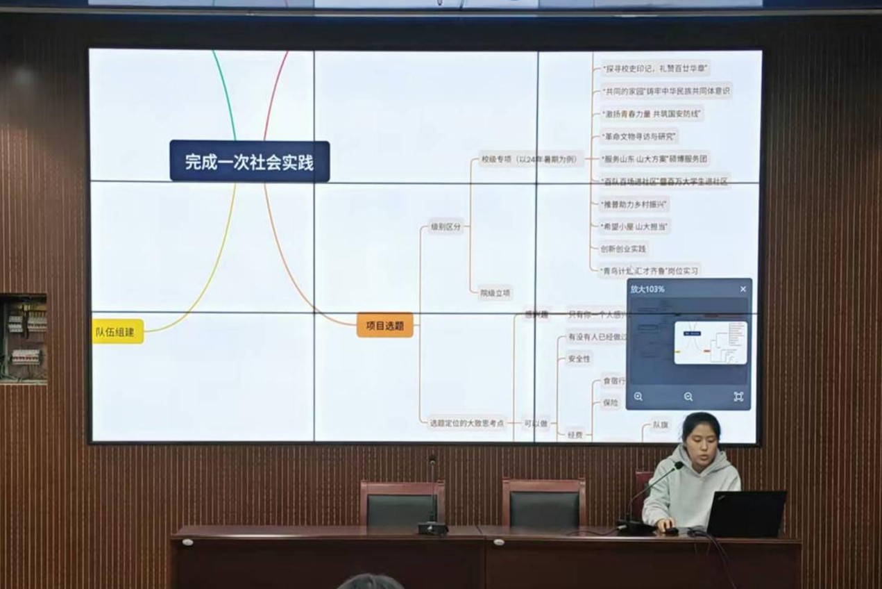 第三支进行分享的队伍是山大哲社的乐智者团队成员曹鹤松。他首先对乐智者团队进行了简要介绍,随后分别从前期立项、实践宣传、结项答辩等流程出发,提供自己的独有见解,并且强调了分工时应当遵循“术业有专攻”、对资源的合理利用与团队协作的重要意义,并呼吁同学们能够积极参与对自己和社会有意义的社会实践活动,在丰富自身,实现自我成长的同时助推社会发展。