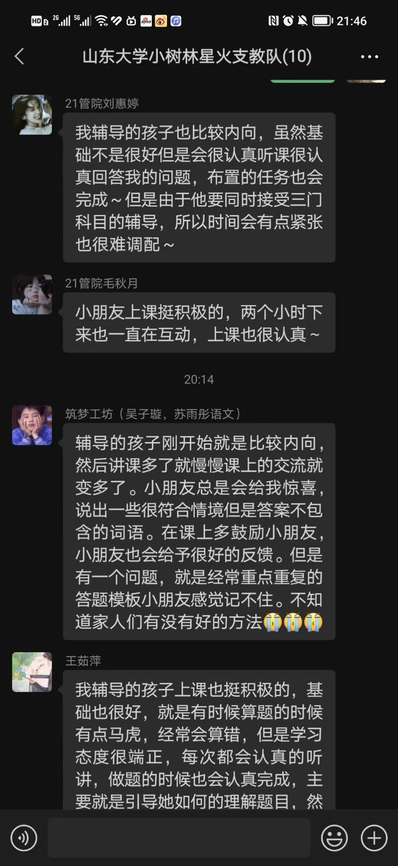我们的线上支教活动到现在已经进行了一周多。1月8日晚上七点半,在任丽新老师的指导下,我们团队开展了一个小型的阶段性的成果总结会,交流分享各自的实践成果、心得体会、遇到的问题以及解决的方法。大家畅所欲言,分享各自的经验看法。通过交流大家普遍认为,在平时的教学过程中要根据自己负责的小朋友的特点,制定相应的教学计划和准备相应的教学材料。在1月15日晚上七点半开展的第二阶段成果总结会上,各位成员纷纷表示作为“过来人”,可以根据自己小学初中时的学习经验对小朋友们进行学习指导,分享学习方法。