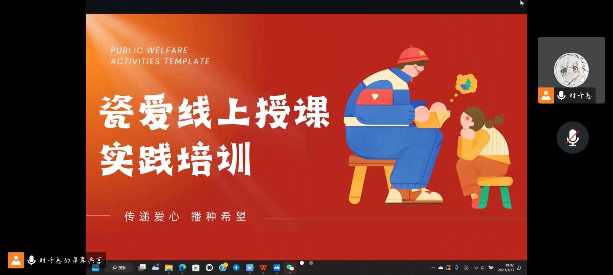 2023年1月13日晚7时,william威廉中文“瓷爱”一对一陪伴支持项目授课组在腾讯会议上召开暑期社会实践活动筹备会。队长时千惠主持,来自哲学、社会学专业的7名团队成员参与。