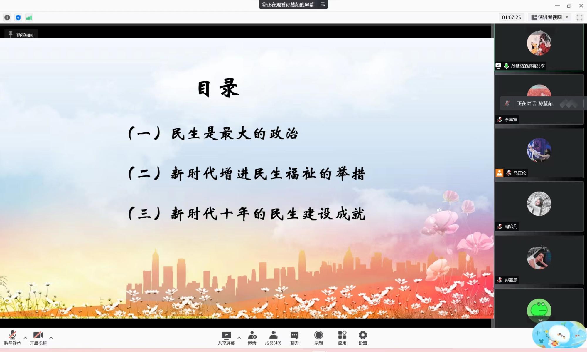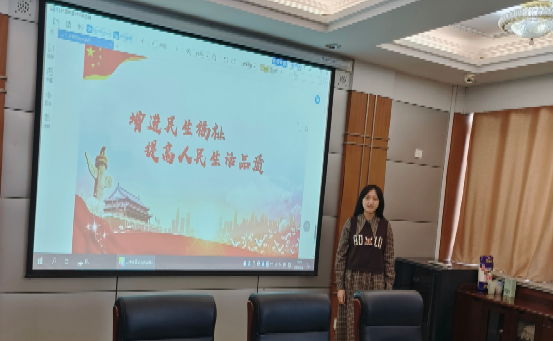 宣讲以民生是最大的政治、新时代增进民生福祉的举措、新时代十年的民生建设成就三部分展开,从民生角度对党的二十大精神进行深入阐释。分队成员在寒假中进行了线上下宣讲实践。1月20日,解颖同学来到山东省日照市东港区郑州路社区宣讲,深入阐释民生的重要性;1月31日,孙慧茹同学深入青岛市李沧区李村街道宣讲,对二十大报告中增进民生福祉的举措进行阐释;2月1日,李嘉萱同学线上展开针对山东省青岛第五十八中学的部分家长同学的宣讲,江山就是人民,人民就是江山;2月4日,闫卓璨同学到山东省肥城市城市热力有限公司宣讲,强调“民之所忧,我必念之;民之所盼,我必行之!”