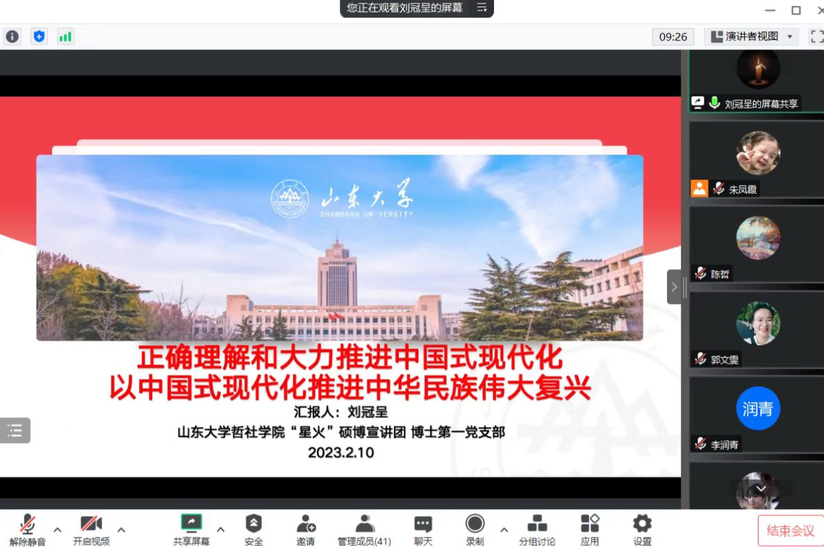 为促进青年党员深入学习习近平新时代中国特色社会主义思想,深刻领会和准确把握党的二十大精神的科学内涵和核心要义,2月10日,williamhill中文哲社学院“星火”硕博宣讲团以“正确理解和大力推进中国式现代化,以中国式现代化推进中华民族伟大复兴”为题开展主题宣讲活动。博士第一党支部支部书记刘冠呈担任主讲人,2021级、2022级党支部全体学生党员参与学习。