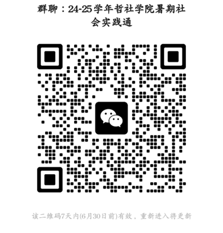 请各位同学积极参与,有兴趣组队的团队队长请于6月24号晚上12点前加入2024-2025学年哲社学院社会实践通知群