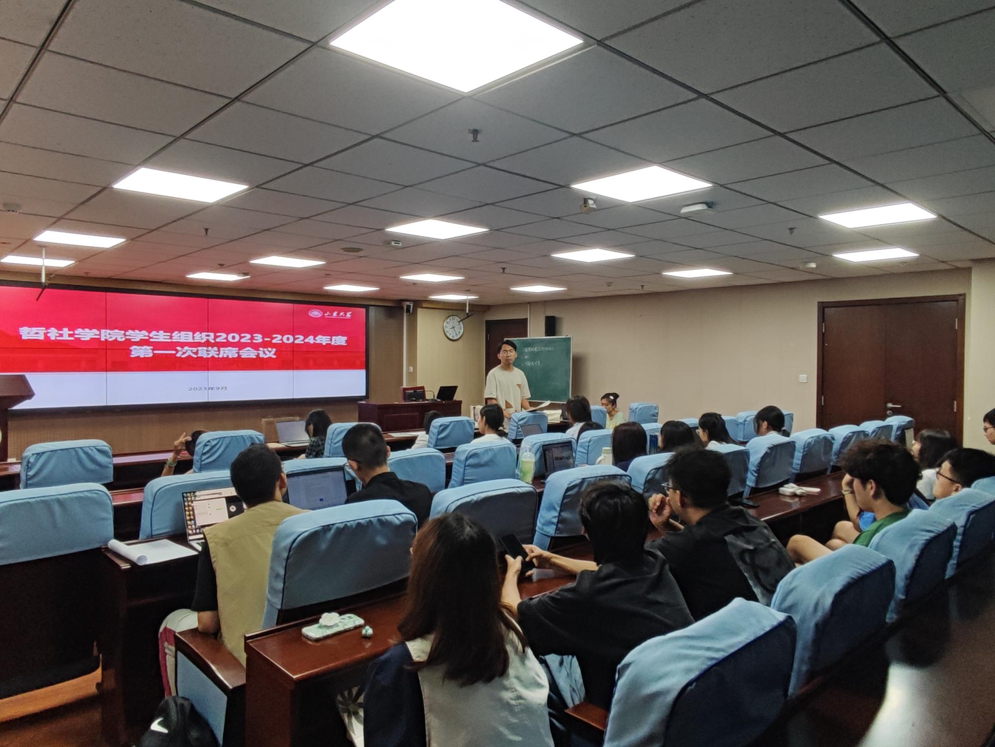 2023年9月9日晚,哲社学院学生组织2023-2024学年第一次联席会议在知新楼A1521召开。哲社学院学生组织主席团、部长团全体成员参与此次会议。