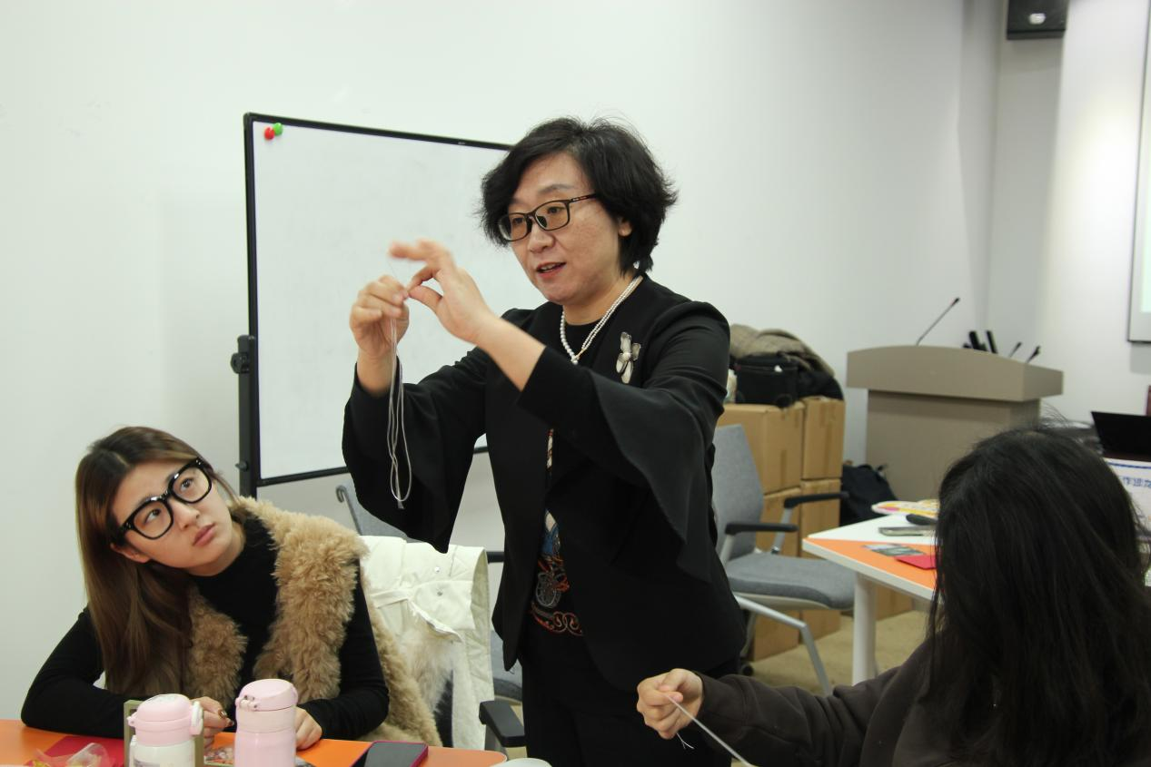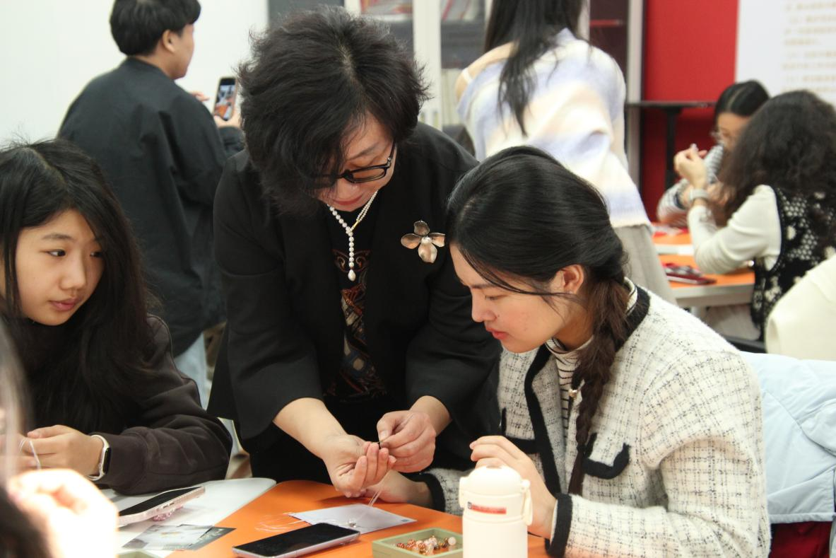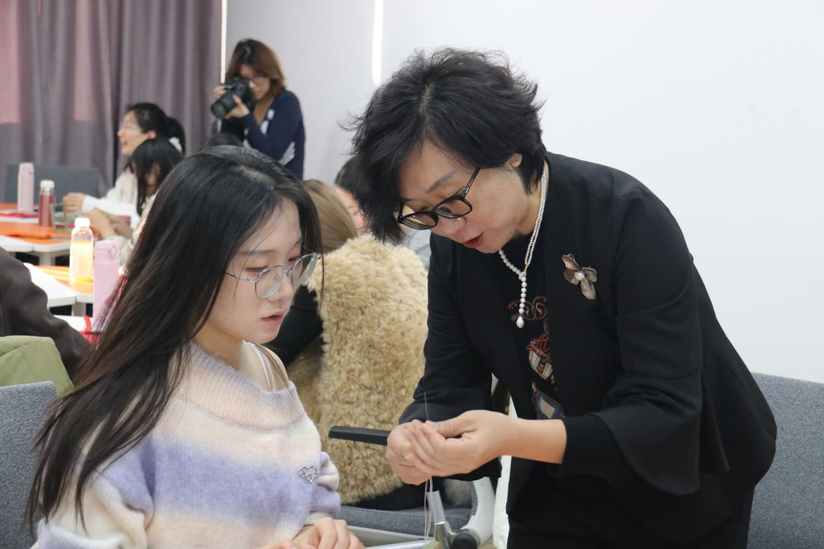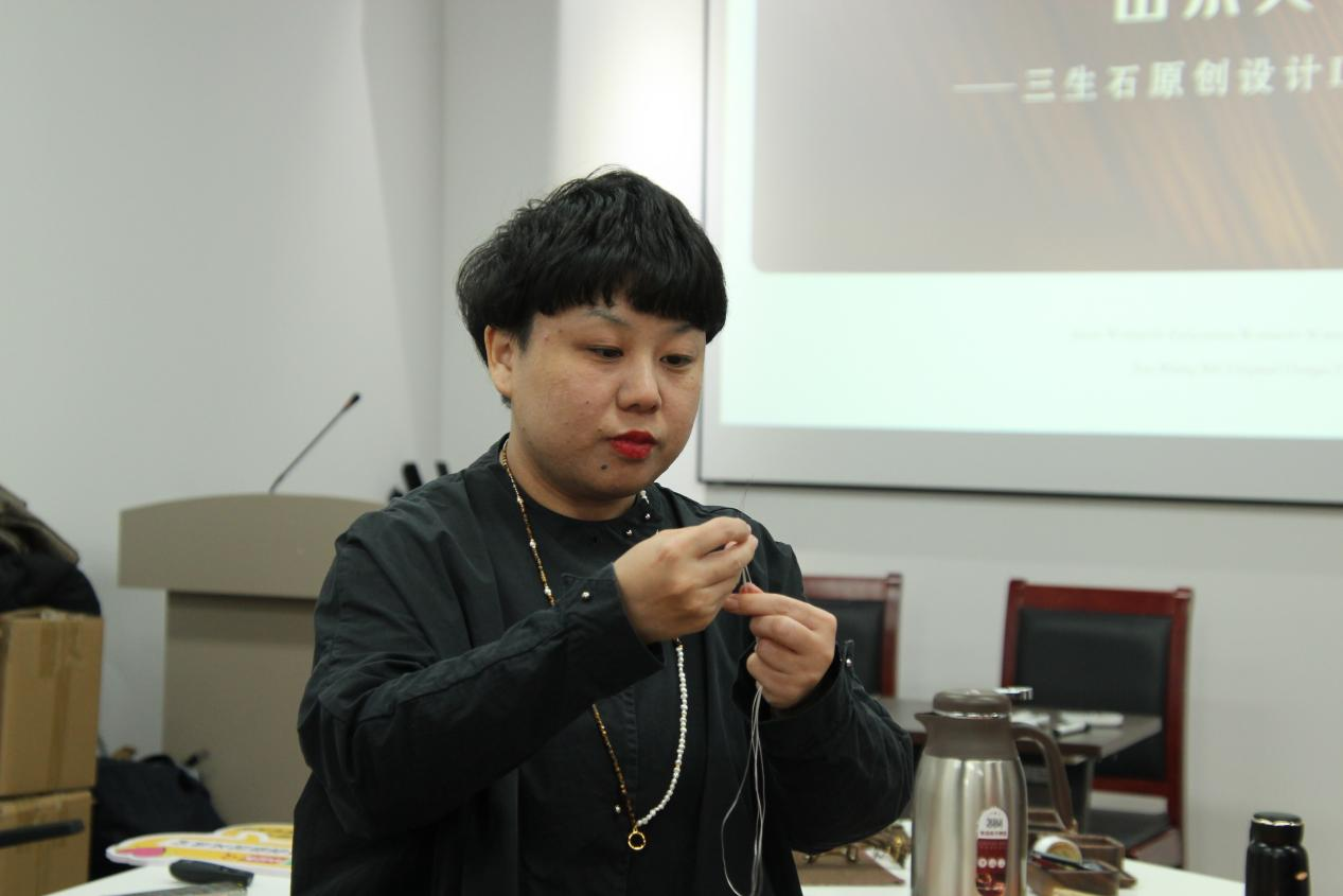 活动伊始,学院党委副书记杨晓玲致辞,向大家介绍了参与此次活动的专家老师,邀请在场师生全身心投入此次手作活动,享受心灵疗愈的过程,感受指尖艺术的独特魅力。随后,来自山东三生石文化传媒有限公司的珠宝专家杨阳与李艳艳两位老师,围绕原创新国风珠宝的设计理念、晶石特性、佩戴搭配技巧等展开了讲解,结合手工制作基础技法进行演示,激发了大家的浓厚兴趣。