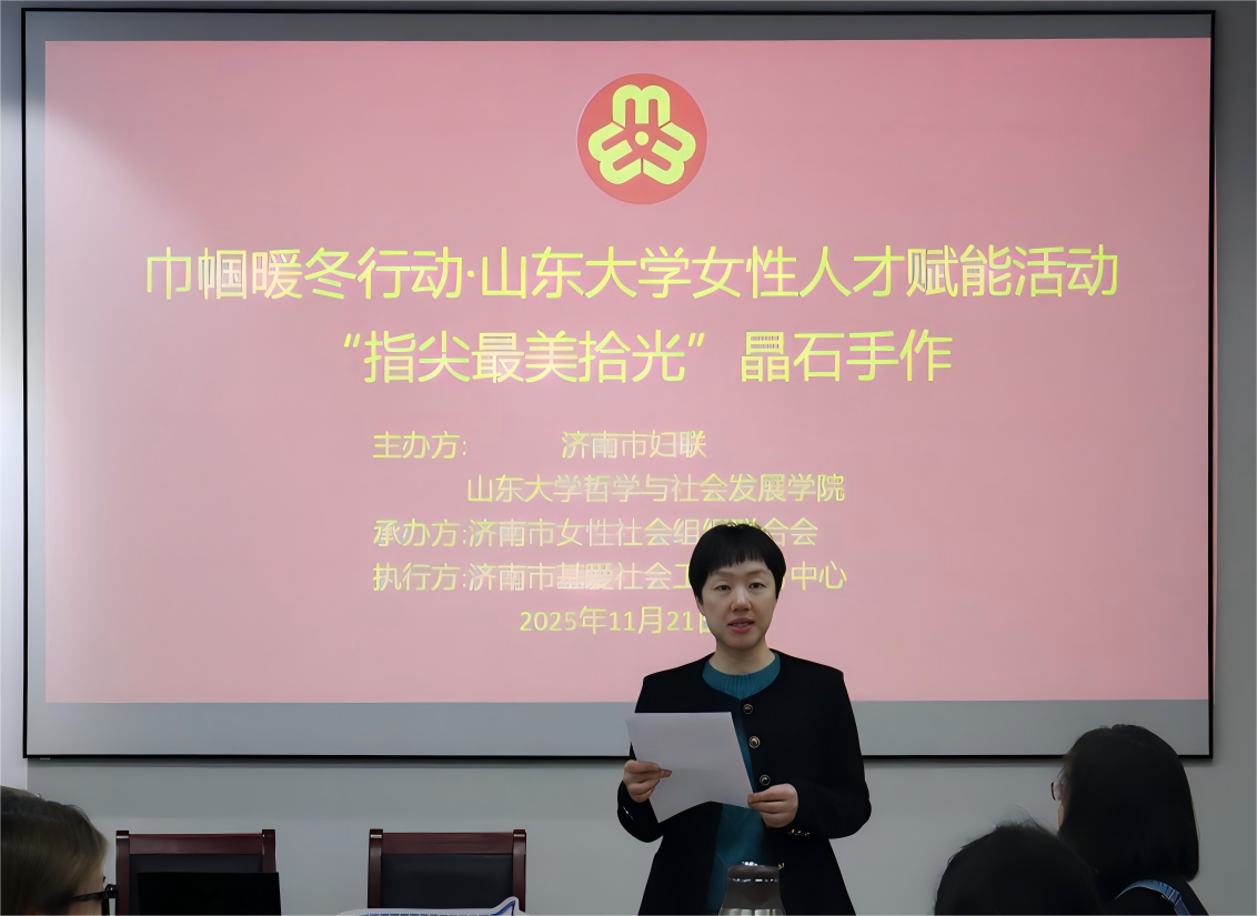 为深入贯彻落实立德树人的根本任务,推动中华优秀传统文化融入思想政治教育,关爱我校女性人才身心健康,11月21日上午,“巾帼暖冬行动·williamhill中文女性人才赋能——指尖最美拾光”暨文化思政特辑活动在中心校区知新楼A115室顺利举办。本次活动由william威廉中文联合济南市妇联共同主办,济南市女性社会组织联合会承办,济南市基爱社会工作服务中心负责执行,学院女性教师代表及研究生学生参与。